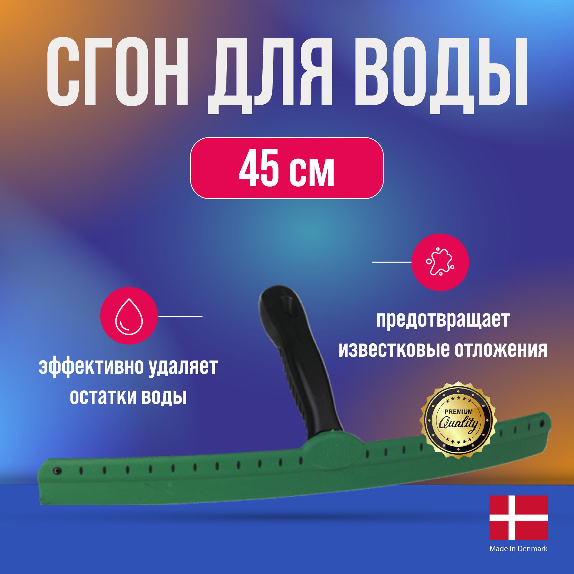 Сгон Vikan эффективно удаляет остатки воды, предотвращает известковый налет. Профессиональный сгон 450 мм, удобен для сушки кузова, методом сгона воды, также может быть использован для удаления воды с любой ровной поверхности, стекла автомобиля, стекла в доме, узкие места в комнатах на полу которых кафель. Это профессиональный сгон и он не сотрется как силиконовые сгоны.