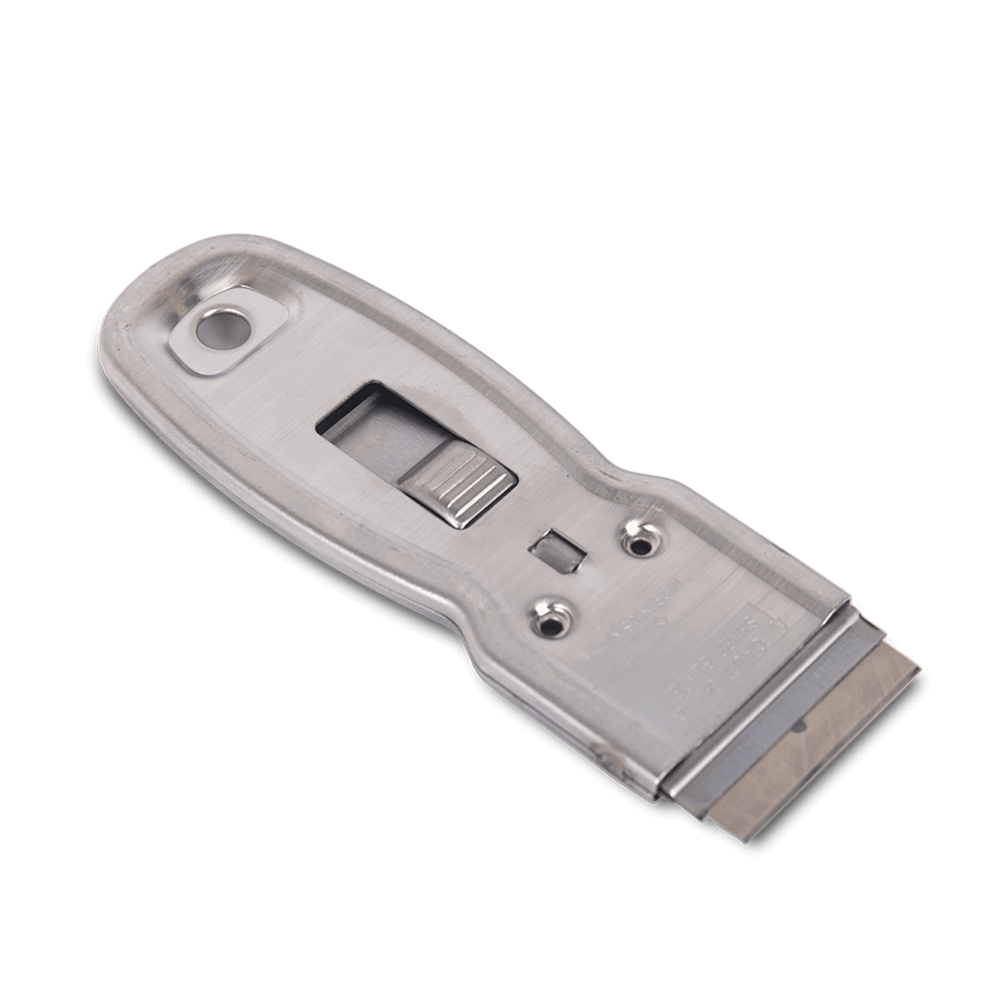 Металлический скребок для стекла и керамической поверхности. Предназначен для быстрого удаления загрязнений типа клея, скотча, краски с гладких не окрашенных поверхностей.
