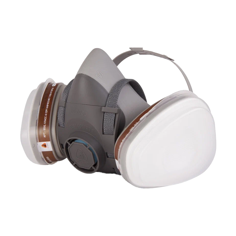 В комплекте: 5500Р Полумаска промышленная (термопласт) - 1 шт; 6510 Фильтры для защиты от органических газов и паров A1 - 2 шт; 6020Р2R Предфильтр для защиты от пыли и аэрозолей P2 - 4 шт; 5101 держатель для предфильтров - 2 шт; нитриловые перчатки - 1 пара.